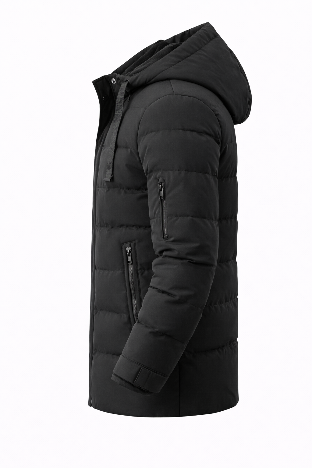 Urban-technical design - Modern medium-long silhouette covering to mid-thigh. Slim fit but comfortable cut allowing layering underneath. Cuffs with flap and buttons to seal from cold.